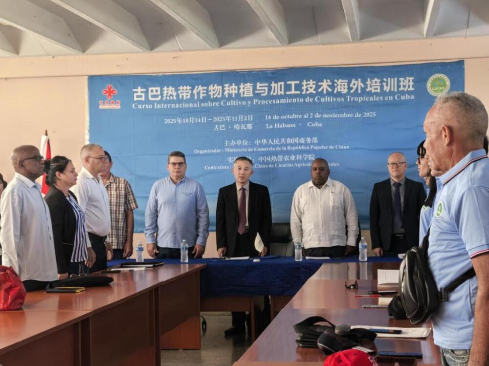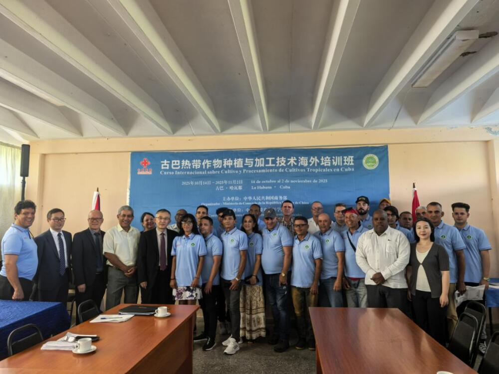 2025年10月14日,中国驻古巴大使馆经商处翟承玉参赞出席由中国商务部主办、中国热带农业科学院承办的热带作物种植与加工技术海外培训班开班仪式。古巴农业部副部长罗德里格斯,科学、环境与农业推广司司长米兰达,农业集团总裁利纳雷斯,“亚历山大·冯·洪堡”热带农业基础研究所所长阿尔梅纳雷斯,中国热带农业科学院专家及古方受训学员共40余人出席仪式。